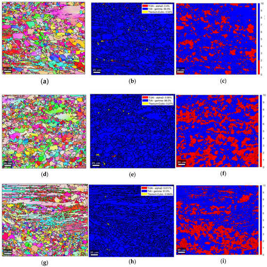 Orientation (a,d,g) and phase fraction (b,e,h) (where blue is γ, red is α2, yellow is β0), and X-DRX maps (c,f,i) (where red is the recrystallised fraction, blue is deformed) of 4822 alloy in HH (a–c), ACCHT (d–f), FCCHT (g–i) conditions at P1 (centre), after 50% primary compression at 1100 °C, 0.001 s−1.