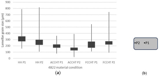 (a) Remnant lamellar grain area analysis showing maximum, minimum, and inter-quartile range of each material condition at P1 and P2 after 50% primary compression at 1100 °C and 0.001 s−1. (b) Positioning of analysis points on compression sample.