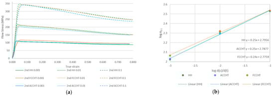 The secondary compression stress–strain curves in Figure 13a show that a profile similar to that of primary compression was followed, i.e., strain hardening to peak flow stress followed by flow softening. The peak flow stresses increase with the strain rate for each material. At a strain rate of 0.001 s−1, all material moved towards near steady-state flow stress between 90 and 100 MPa with the increase in strain during secondary compression. ACCHT material showed the lowest steady-state stress; it is assumed that the steady-state condition would correspond to a quasi-stable microstructure being achieved []. This was not achieved at faster strain rates.