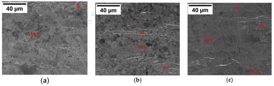 The X-DRX tends to be dependent on the initial lamellar colony size; this is due to grain boundaries acting as nucleation sites for globular morphologies, with high lamellar–lamellar grain boundary density being preferred for globularisation []. Semiatin, Seetharaman, and Weiss reviewed earlier work looking at the relationship between the starting microstructure, flow softening rate, recrystallisation, and flow localisation []. The authors identified that the lamellar characteristics, especially lamellar grain sizes, were the most significant factor influencing the flow stress, with Semiatin, Seetharaman, and Ghosh identifying the effect that grain size and strain rate have on the globularised fraction []. Another factor in the X-DRX and the globularised fraction is the heterogeneous strain distribution across the work piece []. This is shown by the microstructural analysis of lamellar content at P1 and P2 (Table 6). Interestingly, this difference across the workpiece was reduced with ACCHT, perhaps due to the lack of lamellar content at P2 post-CHT, as discussed below.