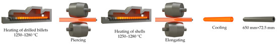 Another example of grain growth under non-isothermal conditions is grain growth in shells after they have been pierced. This is what prompted this study. It should be understood the reasons for the formation of a coarse-grained structure in the production of pipes at the Chelyabinsk Pipe Rolling Plant. The technological scheme (Figure 1) for the production of pipes includes the following operations and features: