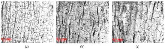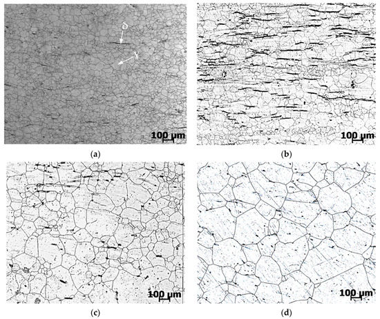 The microstructures obtained during studies in isothermal conditions (Figure 3) are shown in Figure 5. The microstructure of the studied steel AISI 321 consists of austenite (ɣ) grains and contains a small amount of δ-ferrite. The microstructure of the sample after primary deformation at a temperature of 1200 °C with a deformation rate of 1 s–1 is shown in Figure 5a. The microstructures obtained during experimental deformation and subsequent holding at temperatures of 1250, 1150 and 1100 °C for 15 min are shown in Figure 5b–d, respectively. Holding at a temperature of 1100 °C is accompanied by a slight growth of grains, while areas are preserved in which the grain size practically does not change. As a result, a structure with a heterogeneous granular structure is formed.