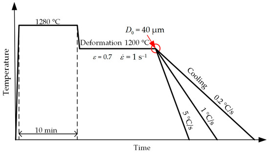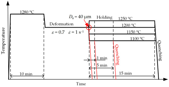 The first series includes isothermal tests. The samples were held at the same temperature of 1200 °C for 1, 5 or 15 min. The next samples for a short time were cooled (or heated) to a holding temperature of 1100, 1150 or 1250 °C (Figure 3) and held also for 1, 5 or 15 min (Table 2). After holding, every sample was quenched with a jet of water.