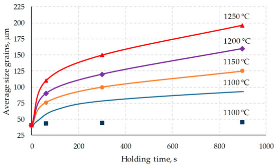 According to Formula (4), the grain growth curves were calculated at holding temperatures of 1100, 1150, 1200 and 1250 °C, which are presented in the form of solid lines in Figure 6. The curve for a temperature of 1100 °C lies much higher than corresponding experimental points, which once again indicates the suppression of grain growth at a temperature of 1100 °C.