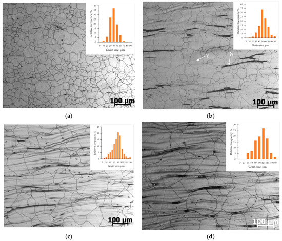 Microstructural studies were performed using an optical microscope C. Zeiss Observer (Carl Zeiss AG, Oberkochen, Germany). The slots made from the longitudinal section of the samples were subjected to electrolytic etching in a 4% solution of nitric acid in ethanol. The grain size was determined by the intersection method.