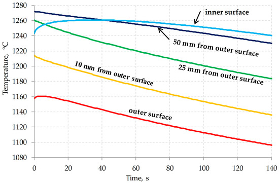 As can be seen in Figure 9, the temperature of the inner surface of the shell rises in the first 20 s. This is due to the fact that after removing the cold piercing plug from the shell, the inner surface heats up due to heat transfer in the wall.