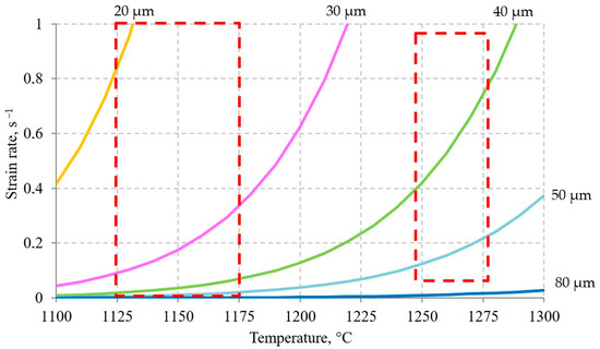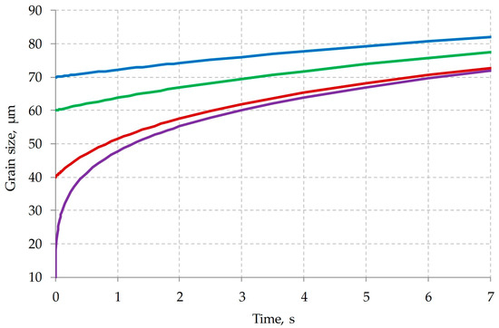 To calculate such a sequence, it is necessary to determine the grain size at the initial moment of time. In the works [17,44,45] previously published by our team of authors, the process of dynamic recrystallization in steel of the current chemical composition was considered. The activation energy dynamic recrystallization, the equation for calculating the Zener–Holomon parameter, the strain required to complete the first cycle of dynamic recrystallization, the grain size formed during dynamic recrystallization, and other parameters were determined. Figure 10 shows a map of grain sizes depending on the strain rate and temperature. In the form of dotted lines, the ranges of deformation speed and temperature inherent in different layers of the shell have been marked. As can be seen in Figure 10, at the end of the piercing process, grains ranging in size from 20 to almost 80 µm can be formed. Note that the temperature of the metal in the middle of the shell wall at this moment is about 1260 °C. As you can see in Figure 11, the initial grain with a size of 0 and 70 µm, after 6–7 s, differs in size by no more than 10 µm. For this reason, without any large error in estimating the final grain size, it can be assumed that the initial grain at the initial time is 25 µm. Taking into account this condition ( = 25 µm), the kinetics of grain growth were calculated. The calculation results are shown in Figure 12.