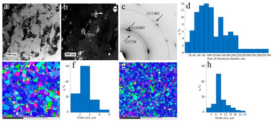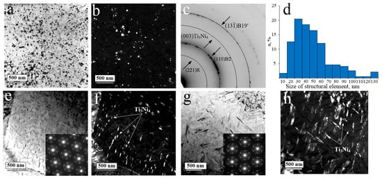 PDA at a temperature of 550 °C for 30 min forms a mixed ultrafine-grained (UFG) structure, which contains the recrystallized grains as well as the polygonized subgrains of B2-austenite with an average size of 130 nm; their fractions are comparable (Figure 1a,b). The elements with a size range of 80–120 nm occupy 43% of the volume; the elements with a size range of 160–200 nm occupy 43% of the volume. The maximum size of the grains and subgrains is 340 nm (Figure 1d). The reflections of Ti3Ni4 precipitates are not revealed. The diffraction arcs (110) and (211) belong to B2-austenite; the reflections of () belong to R-martensite (Figure 1c). The subgrains form conglomerates measuring 480 × 730 nm, which can be observed in dark-field images. The histograms shown in Figure 1 were plotted using the measured average cross-section of the grains/subgrains.