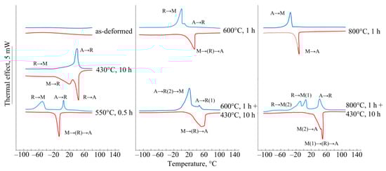 After the solution treatment at 600 °C (a recrystallized structure with an average grain size of 3 μm), similar forward transformations with very close peaks are detected at 9 °C and 1 °C, respectively, and a single reverse MT M → (R) → A with a peak at 34 °C are registered. After PDA at 800 °C (for a recrystallized structure with an average grain size of 9 μm), one forward A → M transformation with a peak at −37 °C and the corresponding reverse one at −13 °C are detected.