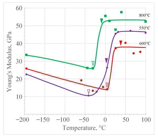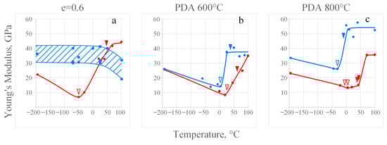 The observed V-shaped elastic modulus curve after PDA (see Figure 4 and Figure 5) as a function of the temperature is in good agreement [,,].