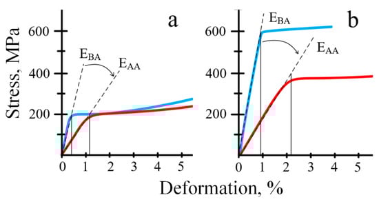 Comparative stress–strain diagrams before aging (EBA, blue curves) and after aging at 430 °C for 10 h (EBA, red curves): (a) 600 °C, 1 h; (b) 800 °C, 1 h.