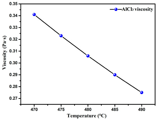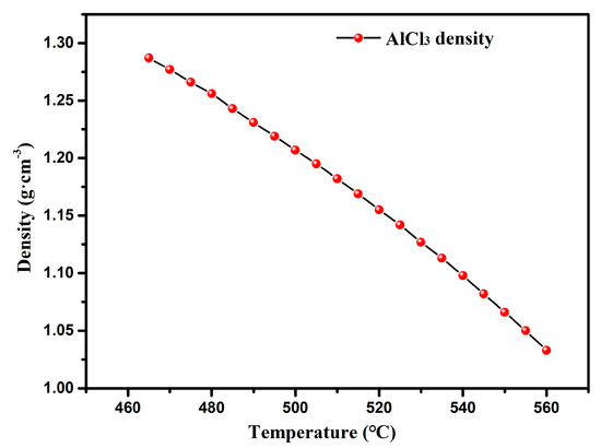 AlCl3 was first prepared by Biltz. W [37] in 1923, via the reaction of 99.5% pure Al powder with dry HCl gas. Subsequently, Baker Analytics and Grothe studied the basic properties of AlCl3, etc. [37]. The density and viscosity of AlCl3 are key physical properties during the thermal reduction process. Based on previous research data, the density of AlCl3 varies with the temperature, as shown in Figure 1. It can be seen that the density of AlCl3 shows a steady downward trend with the temperature rising within 460–560 °C. The following formula is the density formula, fitted according to the data (estimated standard error: 0.15%).