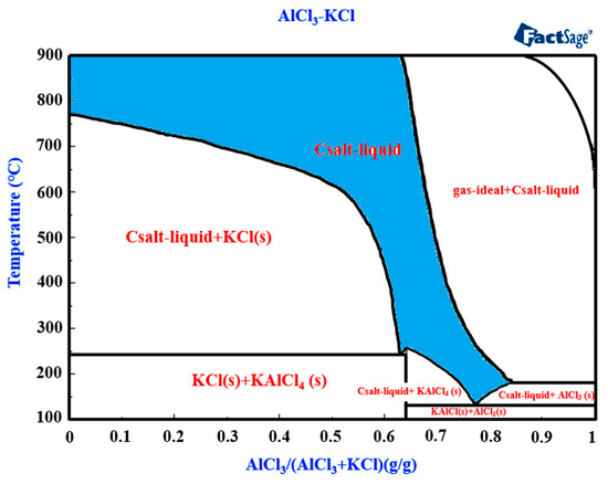 Due to the low melting point and easy sublimation of AlCl3, to prevent the loss of raw materials due to the large amount of sublimation and volatilization of AlCl3, a mixed molten salt AlCl3-KCl is configured, which can effectively suppress the volatilization of AlCl3. As shown in Figure 3, when the AlCl3 content accounts for 80 wt% and above, the binary phase diagram of AlCl3-KCl shows that a large amount of AlCl3 gas is generated. As the KCl increases, the blue part in the figure shows the liquid phase zone of the AlCl3-KCl eutectic salt without gas generation. Therefore, this part can be selected as the area used in the raw material ratio in this experiment, where the mass ratio of AlCl3/(AlCl3-KCl) is 0.65.