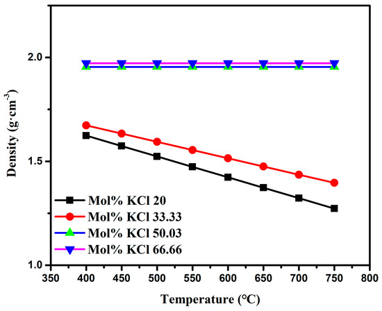 The density of the AlCl3-KCl is based on Carter and Morrey’s [37] work to obtain the following AlCl3-KCl density data, as shown in Table 1. The temperature dependence of AlCl3-KCl under different KCl contents was plotted using Table 1, as shown in Figure 4. It can be seen that as the KCl content increases, the overall density of the AlCl3-KCl shows an upward trend. As the temperature increases, the density of the AlCl3-KCl decreases. When the molar ratio of KCl exceeds 50%, the overall density of the AlCl3-KCl does not change significantly with temperature. The incremented density is due to the melting point of KCl being higher. After the KCl content increases, the overall melting point of the AlCl3-KCl increases. An increasing KCl content can inhibit AlCl3 volatilization. This result is consistent with the calculation results in Figure 4.