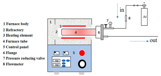The raw materials are mixed with the binder in a mortar. After that, the mixed raw materials are pressed into a round green mass. For the reduction, we place the green mass into the molybdenum crucible and the tube furnace (KF1100 Nanjing Boyuntong (Nanjing, China), as shown in Figure 5). After reaching the specified temperature, this furnace can be loaded into the reaction furnace tube. The heating rate is 15 °C/min, and the insulation is maintained after reaching the specified temperature. According to the analysis of the physical properties and phase diagram of AlCl3&KCl in the previous section, to suppress the volatilization of AlCl3, the molten salt is weighed based on the mass ratio of AlCl3/(AlCl3+KCl) of 0.65. Therefore, this experiment’s molten salt mass ratio of AlCl3: KCl is 1.8. Considering that AlCl3 has the characteristic of volatilizing at low temperatures, it is necessary to increase the content of AlCl3 appropriately during the raw material configuration process. The amount of TiO2 used in each experiment is 5 g, the proportion of molten salt is four times the total mass of the TiO2 added, and the amount of magnesium added is the molar mass of the AlCl3 completely reacted.