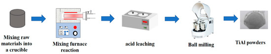 Metal compounds offer both the plasticity of metals, and the high-temperature strength of ceramics in specific compositions, due to the metal compound ordered arrangement of their atoms, and the coexistence of inter-atomic metal bonds and covalent bonds. TiAl-based intermetallic compounds were highly valued in the aerospace industry and other fields, due to their excellent mechanical properties and low density, in the 1950s [1,2]. Nowadays, the TiAl-based alloy is still recognized as a high-end material in the world [3,4]. Due to its high specific strength, high temperature resistance [5,6], corrosion resistance, oxidation resistance [7,8], and excellent biocompatibility, the TiAl-based alloy is widely used in the field of high-end materials in modern life [9,10]. For example, large aeroplanes, submarines, aerospace technology, and artificial bones [11,12,13]. This high-end material should also be popularized in ordinary daily life but, due to its high cost, it has not been applied, and can only be applied in high- and middle-value fields. The reason for this dilemma is the long cycle and high cost of preparing the metal Ti. Since the discovery of metallic titanium, only the Kroll method has produced sponge titanium on a large scale [14,15,16,17]. Therefore, most methods for preparing TiAl-based alloys are element approaches [18,19,20,21], prepared by adding proportional amounts of the elements Ti and Al in a high-temperature melting furnace. Adding Ti separately also causes production costs for TiAl-based alloys.