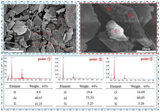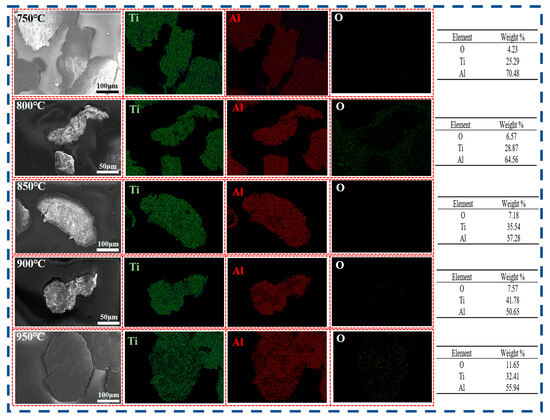 According to literature reports [38], the alloy reaction between Al and Ti at low temperatures is mainly liquid–solid. In this experiment, the main product phase is the TiAl3 alloy after 2 h of reaction at 750 °C. As the reaction temperature increases, from 800 °C to 950 °C, the peak of TiAl3 gradually decreases, while the peak of TiAl2 gradually increases. The peak of TiAl2 gradually increases because external Al reacts before Ti to generate TiAl3 during the reaction process, and then gradually forms TiAl2, as shown in Equation (8). The increase in temperature is more conducive to the formation of the TiAl alloy. From the energy spectrum detected via SEM surface scanning, it can be seen that the obtained TiAl alloy has a uniform distribution of components, with an oxygen content of 4.23 wt%. The reason for such a high oxygen content is that the reduction effect of Al is limited, and TiO2 cannot be reduced to a lower oxygen content state. However, due to the presence of Mg, some O is absorbed, to some extent. As the reaction temperature increases, it is found that the oxygen content in the reaction product is low, at 750 °C.