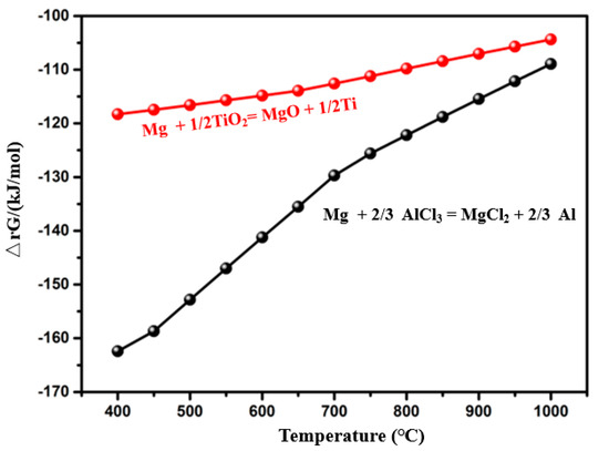Gibbs free energy of the reaction between AlCl3 and TiO2, with Mg.