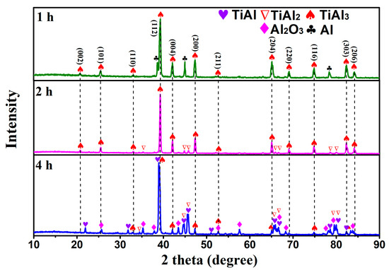 In the previous section, the study of different reaction temperatures in the magnesiothermic reduction of TiO2 in the AlCl3&KCl molten salt system found that the oxygen content of the TiAl3-based alloys generated at 750 °C was relatively low and stable. Therefore, 750 °C was chosen as the optimal reaction temperature. This section takes the reaction time as a single variable, and experimentally studies the effect of different reaction times on the preparation of TiAl-based alloys at 750 °C. We set the reaction time at 750 °C for 1, 2, and 4 h, respectively, to study the effect of the reaction time on the reduction effect during the reaction process. Figure 10 and Figure 11 show that XRD and SEM characterized the reaction products. After reacting at 750 °C for 1 h, the main phases of the reaction products are TiAl3 and metallic Al. The TiAl3 alloy is caused by the short reaction time between Al and Ti, and some of the reduced Al has not yet formed an alloy with Ti. Therefore, a large amount of metal Al has not reacted in the product after one hour of reaction. With the extension of the reaction time, when the reaction temperature is 2 h, the main product of the reaction is TiAl3. After further prolonging the reaction time to 4 h, the main reaction products are the TiAl alloy, and a small amount of Al2O3. The occurrence of Al2O3 is because, with the extension of the reaction time, some Al forms Al2O3 powder through solid-state diffusion with the alloy, after reducing the TiO2. This Al2O3 cannot be removed from the surface of the alloy through acid leaching and flotation. The attached Al2O3 can be seen in the SEM image in Figure 12; a small amount of matte and rough surface substance is attached to the metal surface, which is the Al2O3 generated through the extended reaction time. As mentioned above, a stable TiAl3 alloy powder can be obtained by reacting TiO2 with AlCl3&KCl molten magnesium salt for 2 h at 750 °C.