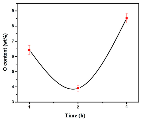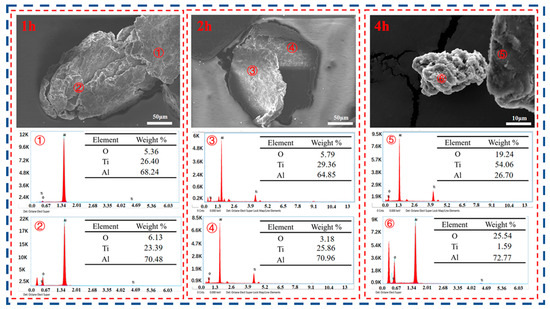As the reaction time increases, the oxygen content in the reaction product gradually increases. At the same time, this is also because the solid-phase-to-solid-phase diffusion reaction between the Al2O3 and TiAl-based alloys occurs at high temperatures, which finally causes part of the Al2O3 to enter the TiAl alloy phase, as shown in Figure 12. The TiAl alloy powder is a coarse powder bonded to the surface of the TiAl alloy, with a high oxygen content and no Ti element, which can be determined as Al2O3 powder. Based on the above analysis, the optimal reaction temperature for the thermal reduction of AlCl3&KCl mixed molten salt magnesium is 750 °C, and the main product generated by the reaction at 750 °C is TiAl3. The oxygen content of the product was analyzed using the JXA82 electric probe. The effect of the reaction time on the oxygen content of the product is shown in Figure 13, with the lowest oxygen content of 3.91 wt% after two hours of reaction.