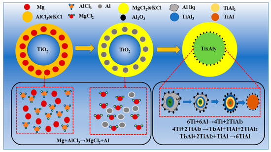 The above experiments indicate that the AlCl3&KCl molten salt system serves as a medium for the magnesium thermal reduction of TiO2, to prepare TiAl3 alloy powder. The schematic diagram of the entire reaction process is shown in Figure 14. At the beginning of the reaction, Mg is ionized in the molten salt to form Mg2+, which reacts with Cl− in the molten salt to form MgCl2, while Al3+ is reduced to metallic aluminium. At this time, the metallic aluminium is not covered by a surface oxide film, and the generated liquid metal Al reacts with TiO2 to generate TiAl-based alloys. The melting temperature of Al is relatively low. At 750 °C, a liquid–solid reaction occurs between the Al liquid and the reduced Ti solid, generating TiAl3 on the surface of the titanium. Afterwards, the internal metal Ti reacts with TiAl3 to generate TiAl2. With the prolongation of the holding time, various TiAl-based alloys react, to generate TiAl alloy powder. The entire TiAl alloy formation process is shown in Equations (5)–(9). This experiment can prepare TiAl3 alloy powder stably at 750 °C for 2 h, demonstrating a new method for preparing TiAl alloy at low temperatures. Moreover, the TiAl3 alloy powder has a low density, high modulus, and strong oxidation resistance, making it an excellent high-temperature structural and layer material.