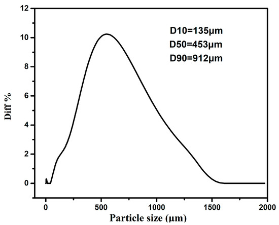 The elements of the TiAl3 alloy powder product prepared in this experiment are shown in Table 2, and the particle size is shown in Figure 15. The Ti content is approximately 28.41 wt%, and the Al content is approximately 67.68 wt%. The TiAl3 alloy prepared in this experiment has a larger particle size. The final products D10, D50, and D90 were 135 μm, 453 μm, and 912 μm, respectively. From the discovery of metallic titanium to the current preparation of titanium alloys, in addition to traditional high-temperature melting and mechanical alloying, many low-cost methods have also been used for preparing TiAl-based alloys. The TiAl-based alloy shows an excellent performance. Developing low-cost and straightforward equipment for new processes, to meet increasing performance requirements, is a hot research topic. These new processes all have the advantages of continuity and low cost. Among emerging technologies, high-temperature self-propagation is the most representative method, but the process controllability of this method is too poor, and there are certain risks. The multi-level deep reduction method is also a relatively novel method that has recently emerged. Still, it also has the problem of a high reaction temperature, which leads to a high energy consumption. Table 3 compares new methods for preparing TiAl-based alloys in recent years, and this experiment. These preparation processes for preparing metallic titanium alloys are currently at the laboratory stage, and there is still a long way to go from the laboratory to industrial production.