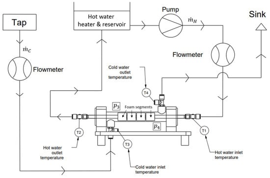 For the quantification of the heat transferred between the mass streams, the four temperatures are measured with type K thermocouples (uncertainty ±0.4 K, supplier RS Components Ltd., Northants, UK). Using the incompressible fluid model, the enthalpy change of each mass stream can be quantified according to , where kJ/kg·K is the heat capacity of liquid water at 300 K []. Conducting a first law analysis on each mass stream then yields