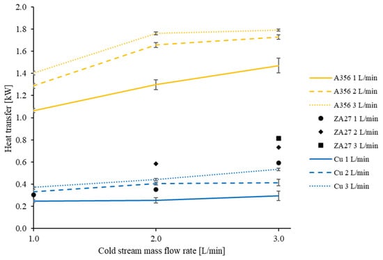 Figure 4 shows the heat transferred from the hot (52.2–60.8 °C) to the cold (15.6–16.6 °C) mass stream plotted against the volumetric flow rate of the cold stream. In addition, different flow rates of the hot stream are represented by the drawn (1.0 L/min), dashed (2.0 L/min), and dotted (3.0 L/min) lines. Three different data groups are presented, i.e., shell-tube recuperators with A356 foam elements (yellow), ZA27 foam elements [] (black), and exposed copper tubes (blue). The error bars in the plot indicate the standard deviation of three independent tests. The standard deviation increased for a high mass flow rate of the cold stream and a low mass flow rate of the hot stream. These combinations resulted in a relatively small temperature change of the cold stream and were thus more sensitive to measurement uncertainty. Analogously, the standard deviation increased for lower mass flow rates of the hot stream. (Analysis of Experimental Uncertainty are provided in Appendix A).