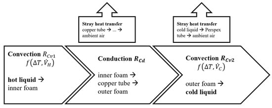 For further analysis, a thermal energy flow model illustrated in Figure 5 was proposed. Thermal energy enters the heat exchanger with the hot liquid and is first transferred to the inner metallic foam. This convective heat transfer increases for larger temperature differences between the fluid and the foam as well as for increased volumetric flow rates. In all experiments, the inlet temperatures of the hot stream (52.2–60.8 °C) and cold stream (15.6–16.6 °C) were kept nearly constant, resulting in an overall temperature difference of about 44 °C. Hence, changes in the convective thermal resistance were predominantly associated with variation of the volumetric flow rate . Next, the thermal energy was conducted from the inner foam and through the copper tube. Due to the high thermal conductivity of the A356 matrix ( W/m·K) and copper tube ( W/m·K) [], the conductive thermal resistance was relatively low. Importantly, there was no significant thermal contact resistance between the foams and the tube, as the A356 melt solidified in direct contact with the copper tube following casting. The good wettability of the copper tube is apparent in Figure 1, where a thin layer of A356 covers the copper tube. This also resulted in a low thermal resistance for the conductive heat transfer from the copper tube into the outer foam. From there, the thermal energy was transferred into the cold liquid via convective heat transfer. Analogous to the hot stream, this convective resistance could be decreased by increasing the volumetric flow rate . Stray heat transfer occurred in the form of thermal conduction along the copper tube and through the Perspex tube (thermal conductivity 0.187–0.216 W/m·K) []. Both losses were considered small compared to the internal heat transfer between hot and cold streams and were, therefore, disregarded. This simplification was supported by similar values of and , indicating that little energy was lost to the surroundings. For the resulting series connection, the overall thermal resistance was the sum of the convective and conductive thermal resistances, i.e., .