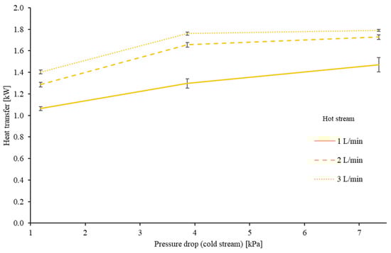 An optimum heat exchanger combines a high rate of heat transfer with minimum pressure drop. In Figure 6, the heat transfer is plotted versus the average pressure drop of the cold stream, and good performance is thus indicated by data points located towards the top left of the graph. Not surprisingly, the performance increased with the flow rate of the hot stream. However, the measurements did not consider the pressure drop of the hot stream, which, of course, increased with the increasing hot stream flow rate. Considering a constant hot stream flow rate, the heat transfer increased with higher cold stream flow rates. However, Figure 6 clearly indicates that any additional heat transfer is at the expense of a distinctly increased pressure drop. In this study, the highest ratio between heat transfer and pressure drop was thus found for the volumetric flow rate L/min.