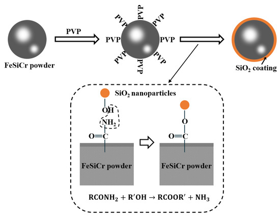 The hydrolytic coating of elemental silicon powder consists of two steps. In the first step, the surface of FeSiCr powder was pretreated with PVP. PVP was adsorbed on the surface of the FeSiCr powder for activation, acting as a bridge between the FeSiCr powder and SiO2 nanoparticles. PVP molecule contains amide groups, which are positively charged in solution. In the second step, elemental silicon powder reacted with water under the catalysis of ammonia to generate silica nanoparticles with monodisperse and uniform size distribution in the solution. Then, the FeSiCr powder was added to the solution with SiO2 nanoparticles, which have hydroxyl groups on the surface that are negatively charged in solution. Through the electrostatic adsorption and chemical reaction between the hydroxyl groups of SiO2 nanoparticles and amide groups of PVP molecules, the SiO2 nanoparticles can be coated on the surface of the FeSiCr magnetic powder. The reaction temperature will influence the rate of hydrolysis reaction and the generated amount of silica nanoparticles, while the ammonia concentration will affect the rate of reaction and the size of silica nanoparticles [25,26], so the experiment analyzes the effect of these parameters. The schematic diagram of the coating process is shown in Figure 1.
