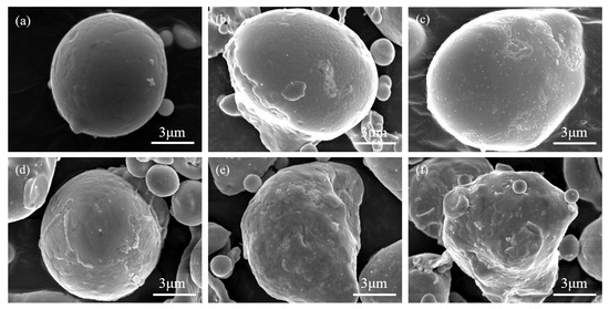 Figure 2 shows the surface morphology of the FeSiCr raw powder and FeSiCr@SiO2 powder prepared at different reaction temperatures. The surface of the raw powder is relatively smooth. For the sample prepared at 25 °C, particle aggregation can be found on the powder surface. Because there is no pre-activation process, the reaction proceeds very slowly so the coating effect is incomplete [25]. For the sample prepared at 40 °C, the area and quantity of particle aggregation increased compared to the sample prepared at 25 °C. For the sample prepared at 50 °C, the coating layer is more complete and some aggregation can be found. For the samples prepared at 60 °C and 70 °C, aggregation of the coating layer on the powder surface is more pronounced, and the uniformity of the coating layer is reduced. The reason is that as the temperature increases, the hydrolysis reaction is more rapid. The number and size of SiO2 nanoparticles increase, and SiO2 nanoparticles grow with heterogeneous nucleation [25].