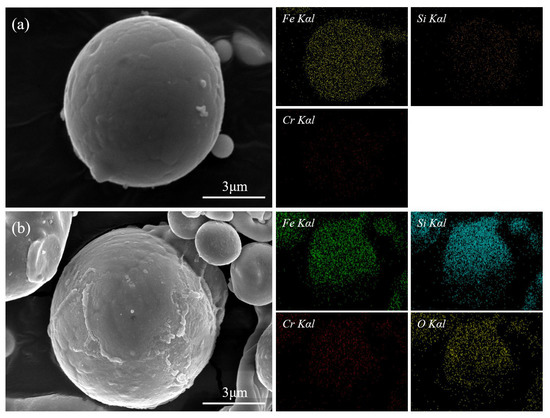 Figure 3a,b shows the SEM micrograph and EDS (energy-dispersive spectroscopy) elemental distributions of the FeSiCr raw powder and FeSiCr@SiO2 powder prepared at 50 °C, respectively. The main elements of the FeSiCr raw powder are Fe, Si, and Cr. After SiO2 coating at 50 °C, the O element appears on the surface of the powder, indicating that the SiO2 layer has been successfully coated through the hydrolysis of elemental silicon powder. The O elements are evenly and completely distributed on the powder surface, indicating that the generated coating layer is complete and uniform, which is important for the insulation of the coating layer.