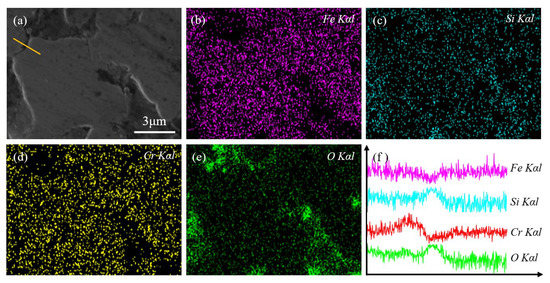 To further determine the structure and composition of the coating layer, the cross-section morphology, Fe, Si, Cr, and O elemental distributions through the mapping and line-scanning of SMCs are shown in Figure 4. The cross-section mapping scan shows that the Fe elements (Figure 4b) and Cr elements (Figure 4d) are mainly distributed in the matrix part of the magnetic powder, while the O elements (Figure 4e) are concentrated around the powder particles, which indicates that the coating layer on the surface of the FeSiCr magnetic powder is SiO2. The line-scanning along the yellow line (Figure 4f) crossing the powder interface indicates that the Si and O elements increase, and the Fe and Cr elements decrease at the interface of the particles. This further indicates that the material of the coating layer is SiO2. This coating effect is beneficial to improve insulation between the magnetic powders.