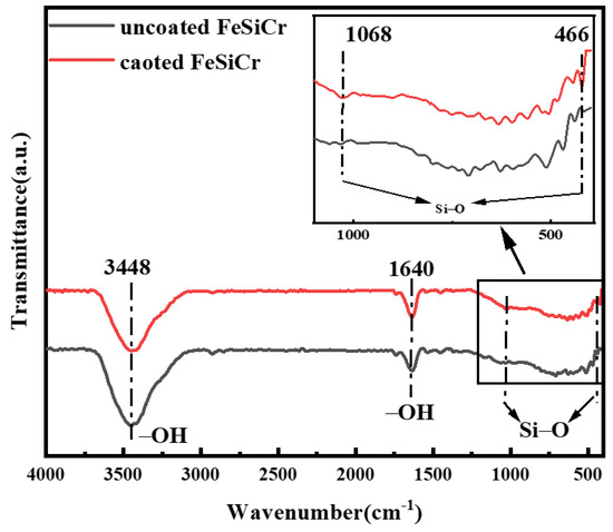 Figure 5 shows the FTIR spectra of the FeSiCr raw powder and FeSiCr@SiO2 powder prepared at 50 °C. The broad absorption bands around 3430 cm−1 and 1630 cm−1 are attributed to the stretching of -OH. The absorption band at 1068 cm−1 corresponds to the asymmetric vibration peak of the Si–O bond [28], and 466 cm−1 is the bending vibration peak of the Si–O bond [22,29]. After the coating of the powder, the intensity of the characteristic absorption peak of the Si–O bond is enhanced, further indicating that the coating layer is SiO2.