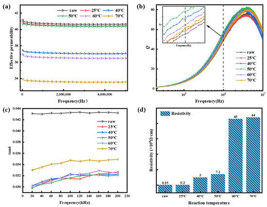 where L is the effective self-inductance, h is the height of the sample, N is the number of cooper wire turns, and D and d are the outer and inner diameters of the samples, respectively. The μe of the FeSiCr SMCs before and after SiO2 coating have good frequency stability. Compared with the sample before coating, the introduction of non-magnetic-phase SiO2 in the coated sample results in a magnetic dilution effect, which decreases the μe from 40.73 to 33.66. Compared to the samples prepared at 25 °C, 40 °C, and 50 °C, the μe of the samples prepared at 60 °C and 70 °C decrease more significantly. The reason is that the reaction temperature has an important effect on the growth of silica nanoparticles. When the temperature reaches above 60 °C, the reaction is more intense, and more silica nanoparticles are produced with larger particle size [25]. This leads to a more significant magnetic dilution effect. This can also be demonstrated by the resistivity of the samples, as shown in Figure 6d. When the reaction temperature reaches above 60 °C, there is a significant increase in resistivity of the samples, which also indicates a significant increase in silica content.