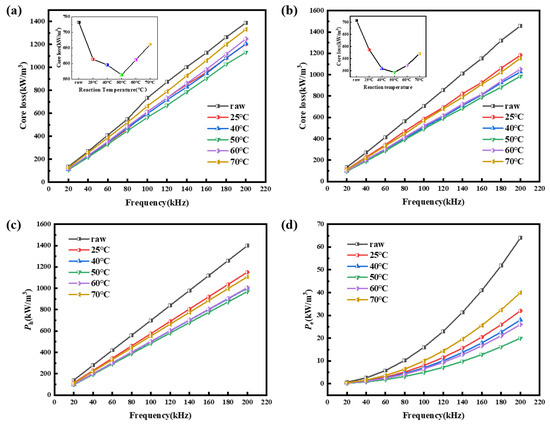 Core loss of SMCs coated by elemental silicon powder through hydrolysis at different reaction temperatures: (a) before annealing, (b) after annealing, (c) Ph after annealing, (d) Pe after annealing.