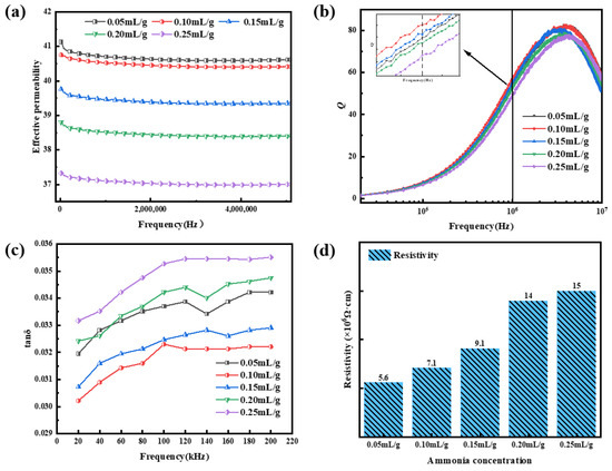 The Q values of the samples are shown in Figure 9b, and all the samples had the same Q tendency of first increasing then decreasing with the increase in frequency. At 1 MHz, the sample with an ammonia concentration of 0.10 mL/g had the highest quality factor of 57.07. Figure 9c shows the loss angle tangent of the samples coated through hydrolysis, with the ammonia concentrations varying from 0.01 mL/g to 0.25 mL/g in the frequency range from 20 kHz to 5 MHz. With the ammonia concentration increase, the loss angle tangent first decreases and then increases, reaching a minimum at 0.10 mL/g ammonia concentration.