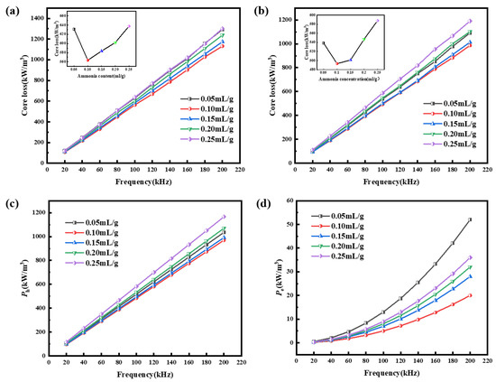Core loss of SMCs coated by elemental silicon powder hydrolysis at different ammonia concentrations: (a) before annealing, (b) after annealing, (c) Ph after annealing, (d) Pe after annealing.