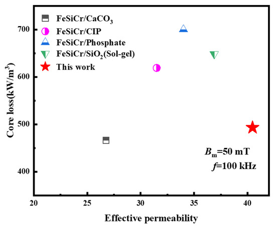 Soft magnetic composites (SMCs), also known as magnetic powder cores, are made of magnetic powders coated with a high-resistivity insulation layer, followed by a condensation process [1,2,3,4]. Having both the highly saturated magnetization ability of metallic materials and excellent insulation characteristics of non-metallic materials, SMCs are an attractive class of soft magnetic materials [5]. They are expected to be widely applied in devices and components used in electronic systems, such as inductors, transformers, motors, etc. [6,7]. At present, electronic devices are developing toward high-saturation magnetization, high effective permeability, high frequency, and low core loss [8,9,10,11], which requires higher temperature resistance, better corrosion resistance, and a stronger insulation of magnetic powder cores. Conventional magnetic powder cores include pure iron powder cores, hi-flux (Fe–Ni) powder cores, FeSiAl powder cores, iron silicon magnetic powder cores, amorphous nanocrystalline magnetic powder cores, etc. [12]. Among them, FeSiCr magnetic powder cores are prepared by adding Si and Cr elements to iron powder, as reported in recent years [13,14,15]. Introduction of the Si element can increase resistivity and reduce core loss. The addition of the Cr element can significantly improve the plasticity, corrosion resistance, and oxidation resistance. Hence, FeSiCr magnetic powder cores have strong aging resistance at high temperatures [16].