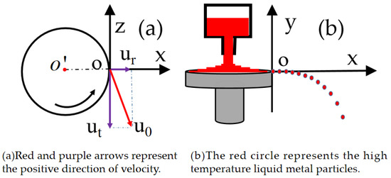 In [27], when calculating the liquid film breakup and droplet formation models, it is assumed that the initial velocity is the same, and the model prediction results are in good agreement with the experimental results. Therefore, it is assumed that the droplets have the same initial velocity after granulation at the edge of the centrifugal disc; the speed diagram is shown in Figure 2. At this time, the initial velocity of the droplets is as follows: