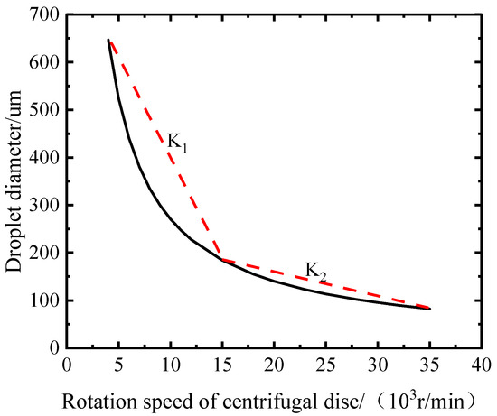 The relationship between the rotation speed of the centrifugal disc and the droplet diameter can be obtained from Formula (4). As shown in Figure 4, the droplet diameter decreases with the increase in the rotation speed of the centrifugal disc because the greater the rotation speed, the greater the centrifugal force on the liquid film. The variation trend in the droplet diameter is consistent with the research findings in [36,37]. When the rotational speed is less than 15,000 r/min, the droplet diameter decreases significantly with the increase in rotational speed. The droplet diameter corresponding to the initial position of 4000 r/min is connected with the droplet diameter corresponding to the initial position of 15,000 r/min. The average slope K1 is −42, indicating that the droplet diameter decreases by 42 μm with the increase in the rotational speed of 1000 r. The droplet is greatly affected by the rotational speed in this range, and the droplet diameter in this range is 184–647 μm. When the rotation speed is greater than 15,000 r/min, the droplet diameter does not change significantly with the increase in the rotation speed. The droplet diameter corresponding to 15,000 r/min is connected to the droplet diameter corresponding to 35,000 r/min, and the average slope is −5, indicating that the droplet diameter decreases by 5 um when the rotation speed increases by 1000 r. The droplet diameter in this interval is less affected by the rotation speed. The droplet diameter is 82–184 μm, and the droplet diameter after granulation is relatively stable. When it is greater than 25,000 r/min, the effect of increasing the rotation speed on the droplet diameter decreases. In the range of 15,000–25,000 r/min, we selected five different diameters of droplets (184 μm, 155 μm, 140 μm, 123 μm and 113 μm) for analysis and calculation.