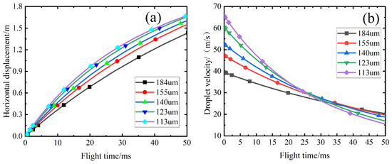 The relationship between the droplet flight time and the horizontal displacement and velocity can be obtained from Formulas (14) and (15), as shown in Figure 6. At the same time, the droplet flight displacement increases with the decrease in the droplet diameter. It can be seen from Formulas (1)–(4) that the smaller the droplet diameter, the greater the initial speed. The larger the initial velocity of the droplet, the more obvious the velocity changes with time during flight. From Formula (9), it can be seen that the droplets with a large initial velocity are subjected to a large amount of environmental gas resistance. At the same time, from Formula (6), it can be seen that the smaller the droplet size means the smaller the inertia, and it is easier to change its speed; thus, the droplet velocity changes significantly at a high speed. The change in the droplet flight velocity and displacement is consistent with the literature [38,39].