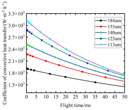 The relationship between droplet flight time and the convective heat transfer coefficient can be obtained from Formula (17), as shown in Figure 7. The convective heat transfer coefficient decreases with the increase in flight time, and the initial value increases with the increase in droplet diameter. Because Formula (17) contains Formulas (4) and (11), it can be seen that the convective heat transfer coefficient is negatively correlated with the droplet diameter and positively correlated with the velocity—that is, the convective heat transfer coefficient increases with the smaller droplet diameter and increases with the increase in velocity. During flight, the droplet diameter remains unchanged, and the velocity decreases with the increase in the distance, which reduces the convective heat transfer coefficient.