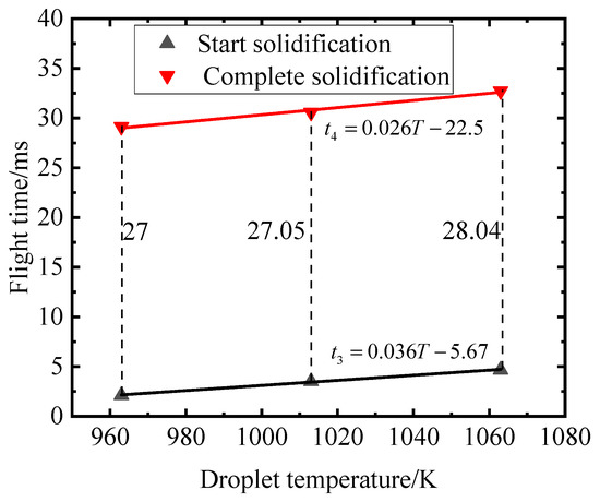 The velocity of the droplet, the temperature difference between the droplet surface and the surrounding environment, and the emissivity of the surface and the wall surface are considered. It was found that radiation heat transfer plays a small role even under a large temperature difference; so, it was ignored. Therefore, during the flight of the metal droplets, the convective heat transfer on the surface of the droplets plays a leading role. The relationship between droplet temperature and time can be simplified with the following equation: