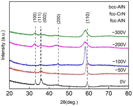 Figure 2 illustrates the XRD diffraction patterns of the AlCrSiN coatings prepared at different bias voltages. As anticipated, the diffraction patterns exhibited a combination of bcc-AlN (PDF #70-0354), fcc-AlN (PDF #80-0010), and fcc-CrN (PDF #76-2494) phases across all five sets of coatings. When the pulse negative bias was not applied, the coating displayed strong bcc-AlN diffraction peaks along the (100), (002), and (110) crystal planes, along with weak fcc-CrN diffraction peaks along (200) crystal planes. As the pulse negative bias voltage increased from 0 to −100 V, the diffraction peaks of the bcc-AlN phase growing along the (100) and (002) crystal planes gradually weakened, while those along the (110) crystal plane increased, with the intensity reaching its maximum at 2θ = 58.52°. This behavior can be attributed to the formation of the amorphous Si3N4 phase in the coating, which hinders grain growth within the coating. Upon further increase in the substrate negative bias to −300 V, the diffraction peak of the (100) crystal plane strengthened, while that of the (110) crystal plane weakened. A weak peak of the fcc-CrN diffraction peaks was detected in the coatings deposited at −100 V bias voltage, while the fcc-CrN diffraction peak broadened and shifted to small angles in the films deposited at −200 V and −300 V bias. This phenomenon might be attributed to a tendency for phase separation into fcc-CrN domains at −100 V bias voltages, which is not observed at lower bias voltages. Additionally, all diffraction peaks slightly shifted to lower angles and broadened, indicative of increasing growth stress in the coating due to stronger ion bombardment effect [14]. Furthermore, due to the solid solution formed by some Cr atoms with a smaller atomic radius (0.127 nm) replacing Al atoms with a larger atomic radius (0.143 nm), no distinct diffraction peaks of the CrN phase were detected [15]. The small amount of Cr dissolved in the AlN lattice causes AlN lattice distortion, resulting in an increased lattice constant and a shift of the AlN phase diffraction peak to smaller angles. As the bias voltage increased, the evaporated ions gained greater energy and strongly bombarded the deposited coatings, which lead to the greater lattice distortions and an increased number of defects. In the XRD pattern (Figure 2), no diffraction peaks of SiNx were observed, indicating that the SiNx phase in the coating exists in an amorphous state, thus forming the hard nano-crystallites of the AlN phase surrounded by thin amorphous states, thereby forming a nanocomposite structure [16].
