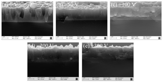 Cross-sectional morphologies of the AlCrSiN coatings deposited at different pulse bias voltages. (a) 0 V; (b) −50 V; (c) −100 V; (d) −200 V; (e) −300 V.