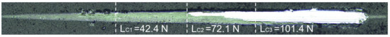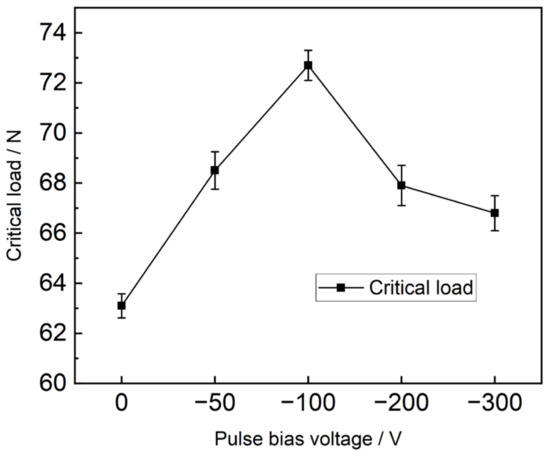 The bonding strength between the AlCrSiN coating and the substrate was characterized using a scratch test, and the scratch morphology of the coatings at a pulse bias voltage of −100 V is shown in Figure 6. The scratch process of the coatings can be generally divided into three stages: the microcracks initiation stage (critical load is represented by Lc1), where the coating still remains effective despite the presence of microcracks; the local peeling stage (critical load is represented by Lc2), during which the coating’s functionality begins to be affected, and partial delamination and flaking occur; and the complete peeling stage (critical load is represented by Lc3), where the substrate is completely exposed, indicating complete coating exfoliation. The second stage is typically defined as a sign of coating adhesion failure and represents the adhesive strength of the coating. Figure 7 illustrates the critical load of the coatings at different pulse bias voltages. It can be observed that the critical load of the coatings increased first and then decreased with increasing bias voltage. The coating prepared without bias applied to the substrate exhibits the lowest critical load of 62.8 N. In this case, ions were freely deposited on the surface of the substrate, making microcracks more prone to occur and propagate along the surface and defects, leading to rapid coating failure. On the other hand, the highest adhesive strength of the coating is obtained at a pulse bias voltage of −100 V, reaching 72.7 N. Several factors contribute to this improvement. The first reason is that the coating structure under this condition possesses high density, leading to improved adhesive strength, as shown in Figure 4. Moreover, the use of arc ion plating technology releases high-energy particles to bombard the surface of the substrate, which can form a clean and superior chemical bonding interface between the coating and substrate surface, effectively improving the adhesion strength. Additionally, slight differences in grain size distribution or local epitaxial growth caused by different precipitations of the substrate variants may be another reason [27]. However, as the bias voltage is further increased, the critical load decreases. The research by Fan et al. [10] reported that the residual stress gradually decreases with an increase in the bias voltage, as high residual stress can accelerate the cracking and peeling of the coating, which aligns with the experimental results.