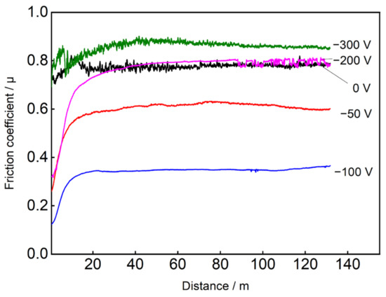 As shown in Figure 9, the friction coefficient of the AlCrSiN coatings gradually decreases from 0.78 to its lowest value of 0.35 as the pulse bias voltage increases from 0 to −100 V. This decrease in friction coefficient can be attributed to the strengthened ion bombardment during deposition, which enhances the density of the coatings and leads to the formation of a central cubic structure AlN within the coating [29]. The high density and the presence of a face-centered cubic structure in the coating contribute to reducing the friction coefficient. However, with a further increase in pulse bias voltage beyond −100 V, the friction coefficients of the AlCrSiN coatings start to increase. In this case, the dense structure of the coating is damaged due to the high-energy ion bombardment, and the excessive pulse bias voltage may lead to an increase in internal growth stress and thermal stress, both of which contribute to an increase in the friction coefficient [30].