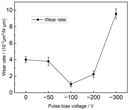 Figure 10 illustrates the wear rate of the AlCrSiN coatings deposited at different pulse bias voltages. The wear resistance of coatings exhibits a gradual and subsequent significant weakening as the bias voltages increase. Notably, the wear rate is minimized at a pulse bias voltage of −100 V, reaching 1.02 × 10−3 μm3/N·μm, indicating the highest wear resistance at this condition. Conversely, the wear rate reaches its maximum value of 9.56 × 10−3 μm3/N·μm when the pulse bias voltage is −300 V. These findings are consistent with the changing trends observed for the friction coefficient, microstructure, and mechanical properties. In addition, combined with the results of XRD pattern analysis, when the negative bias of the substrate is −100 V, the appearance of polymorphic (bcc-AlN and fcc-AlN) AlN phases further improves its wear resistance [31].